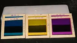 Цветокоррекция при печати субтрактивным методом происходит за счёт фильтрации света, которым освещается негатив. Для этого в световой поток лампы добавляют абсорбционные светофильтры дополнительных цветов — жёлтого, пурпурного или голубого[102]. Светофильтр каждого из этих цветов непосредственно воздействует на экспозицию, получаемую соответствующим зонально-чувствительным слоем фотобумаги. Например, жёлтый светофильтр вычитает из белого света лампы синюю составляющую, уменьшая экспозицию, получаемую синечувствительным слоем. В результате, при её проявлении выход жёлтого красителя в этом слое уменьшится, устраняя нежелательный оттенок[* 3]. Аналогичным образом действуют и два других светофильтра, уменьшая выход красителя своих собственных цветов[103]. При машинной печати цвет и плотность светофильтров определяются встроенным денситометром, а при ручной — при помощи пробных отпечатков (стрип-тестов) или цветоанализатором[104].