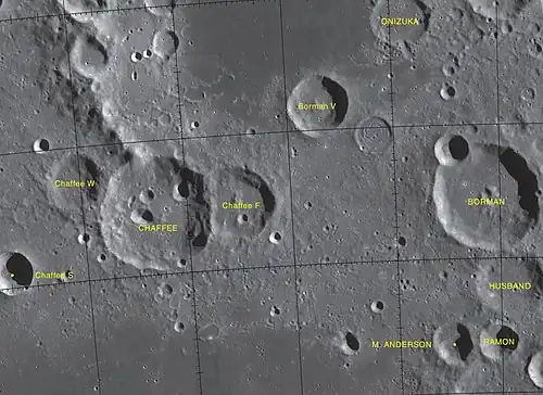 ![]() Снимок зонда Lunar Reconnaissance Orbiter. Кратер Хасбанд в центре снимка. | |