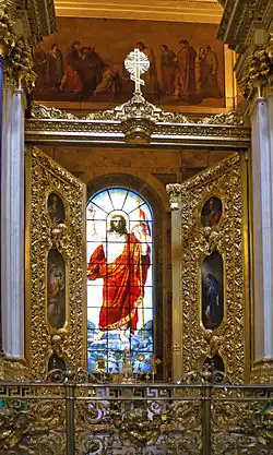 В интерьер православного храма витраж был включён по предложению автора одного из вариантов проекта мюнхенского архитектора Лео фон Кленце. Изображение Воскресшего Спасителя в рост в большом окне главного алтаря было одобрено Священным Синодом и лично императором Николаем I, несмотря на то, что витражи обычно сооружают в католических храмах. Изготовлением в стекле руководил М. Э. Айнмиллер — глава «Заведения живописи на стекле» при Королевской фарфоровой мануфактуре в Мюнхене. Площадь витража составляет 28,5 квадратных метров, отдельные стёкла скреплены свинцовыми пайками. К 1843 году витраж был установлен в окне собора в Санкт-Петербурге. Он является ключевым памятником в истории витражного искусства в России. Установка его в главном храме России утвердила витраж в системе оформления православных церквей страны. Витражи получили «законные» права в православных храмах. А изображение Воскресшего Спасителя в алтарном окне Исаакиевского собора стало иконографическим образцом для многих витражей в храмах России, как в XIX веке, так и в наше время[5].