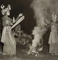- Деятельность. Слово сембахьянг на малайском языке является синонимом исламского ритуала намаз. [5] Оно произошло от объединенного слова sembah-hyang, что означает «поклоняться хьянгам». [6] В балийском священном танце Sanghyang Dedari участвуют неполовозрелые девушки в состоянии транса. С помощью сложных ритуалов для вызова духов, хьянги овладевают девушками и заставляют их бессознательно выполнять сложные танцевальные движения.[7] Sanghyang Jaran — это балийское название для танца Kuda Lumping, в котором также участвует дух, вводящий исполнителя в транс.