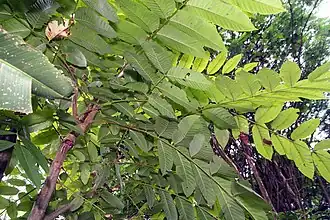 Дерево высотой до 40 м, ствол может достигать в диаметре до 180 см, однако обычно этот показатель равен 80 см. Крона дерева открытая, с низким вертикальным ветвлением. Кора — серо-коричневая, может отшелушиваться маленькими кусочками неправильной формы. Листья сложные, пильчатые, 20—50 см в длину. Каждый лист составляют 5—9 пар листочков по 7,5—15 см длиной и до 10 см шириной, сверху ярко-зелёные, снизу — серовато-зелёные.
