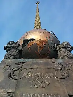 Новый обелиск построен в 2014 году к 100-летию единения Тувы и России по проекту бурятского художника Даши Намдакова. Он представлен ансамблем из трёх львов, которые держат земной шар, увенчанный шпилем. Внешне памятник очень похож на предыдущий обелиск. На нём изображены грандиозные фигуры восточных драконов и высокая стела, декор которой выполнен в виде символических животных, переплетающихся в порыве восхождения к небу. Кроме того, люди видят двенадцать космогонических анималистических образов, которые составляют буддийский гороскоп. Кроме того, на площади, по соседству с обелиском, установлены скульптурные группы — бронзовая «Царская охота», выполненная также Д. Намдаковым и мраморная «Мой дом», автором которой является киргизский художник Жусупов Ибрагим. Работа И. Жусупова выполнена в рамках первого международного скульптурного симпозиума, который проводился в конце июля 2014 г. в Кызыле, и заняла второе место. Скульптура «Мой дом» состоит не из одного, а сразу из двух элементов: верблюда везущего поклажу и мальчика-пастуха, который стоит возле него.