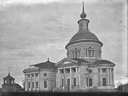 В плане храм симметричен относительно центральной оси. Основной объём здания имеет форму ротонды с полукружием апсиды. Первоначально ротонда была построена в трёх светах и была завершена высоким куполом с цилиндрическим световым фонарём и маленькой главкой с длинным шпилем. В световом фонаре имелись четыре окна, ориентированных по сторонам света. К основному объёму пристроены два боковых придела — северный и южный, прямоугольные в плане и завершённые с востока и запада полукружиями. Приделы декорированы четырёхколонными входными портиками тосканского ордера. Апсида и приделы имели трёхступенчатую кровлю. Обширная трёхнефная трапезная вытянута поперёк оси храма и соединена с ним коротким переходом. Трапезная была увенчана маленькой декоративной главкой и имеет пологую купольную кровлю[2].