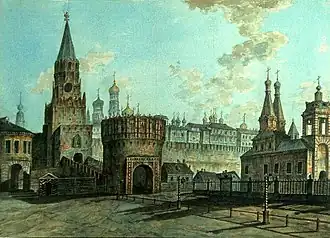 ![]() 1817 год. Вид Манежа, Кутафьей башни и церкви Николы в Сапожках. Акварель М. Н. Воробьёва | |
