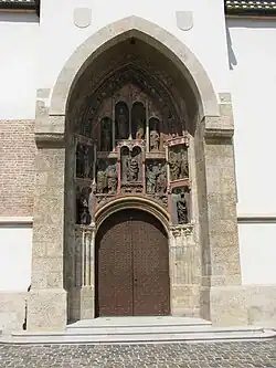 Церковь святого Марка знаменита также готическим южным порталом XIV века. Пятнадцать деревянных скульптур работы пражского мастера Ивана Парлера расположены в отдельных нишах. В верхней части портала — Богородица и Иосиф с младенцем Иисусом, ниже — 12 апостолов. Часть статуй аутентичные, другие же более поздние, установленные взамен утраченных. На северо-западной стене церкви можно увидеть льва, который держит древний герб Загреба, и дату — 1499 год. В интерьере храма интересны фрески с изображениями членов хорватской королевской семьи.