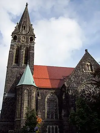 Колокольня церкви, с характерным остроконечным каменным шпилем, является самой высокой в Люденшайде: её высота составляет 61,5 метра. Она доминирует над значительной частью городского центра и образует важную доминанту в городском пейзаже. В неоготическом здании использованы многие элементы высокой готики: за образец была взята Троицкая церковь (нем. Trinitatis-Kirche) в берлинском Шарлоттенбурге. Орган храма был также создан в 1902 году и перестроен (отремонтирован) в 1957 году: в 2008 году конструкция инструмента была в значительной мере возвращена в свое первоначальное состояние.