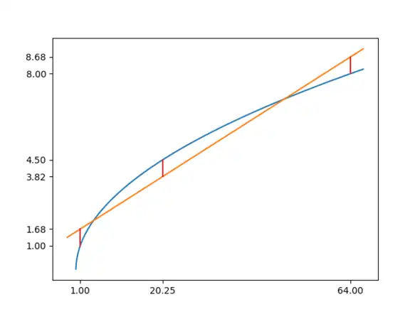 Допустим, что необходимо приблизить функцию квадратного корня с помощью линейной функции (многочлена первой степени) на интервале (1, 64). Из условия теоремы, нам необходимо найти (в рассматриваемом случае — 3) точек чебышёвского альтернанса. Поэтому, в силу выпуклости разности квадратного корня и линейной функции, таковыми точками являются единственная точка экстремума этой разности и концы интервала, на котором происходит приближение функции. Обозначим . — точка экстремума. Тогда имеют место следующие уравнения: