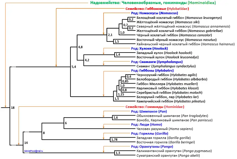 Филогенетическое дерево современных человекообразных обезьян. Цифры в узлах дерева показывают ориентировочное время расхождения филогенетических групп (млн лет) по данным молекулярной филогенетики. Все данные по http://www.onezoom.org/, 07.09.2017