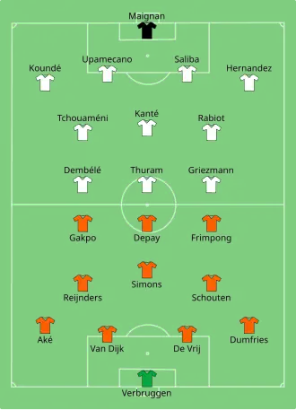- 1 2 3 Tactical Line-ups – Netherlands v France (англ.). UEFA.com. Union of European Football Associations (21 июня 2024). Дата обращения: 21 июня 2024. Архивировано 8 июля 2024 года.