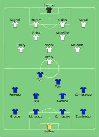 Обменявшись голами в первом тайме (у французов забил Зидан с пенальти за нарушение Матерацци против Малуда, у итальянцев — Матерацци с углового, поданного Андреа Пирло, лучшим игроком финала), сборная Франции проиграла сборной Италии в серии послематчевых пенальти (единственный промах допустил Давид Трезеге, попав в перекладину).