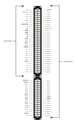Впервые шина ISA появилась в 1981 году на компьютерах IBM PC с использованием видеокарт MDA и CGA[1]. Это была 8-разрядная шина с частотой до 8 МГц и скоростью передачи данных до 4 Мбайт/с (передача каждого байта требовала минимум двух тактов шины). Разъём состоял из 62 контактов, из которых 8 использовалось для данных, 20 — для адреса, остальные — для управляющих сигналов, а также подачи напряжений питания (GND, +5 В, −5 В, +12 В и −12 В).