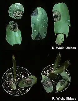 Симптомы: почерневшее, влажное, слизистое поражение обычно начинается на линии почвы у основания растения и прогрессирует в верхней части кладодий и в других сегментах растений. Растения увядают, разрушаются и часто умирают.