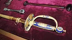 Шпага украшена лазуритовым эфесом и гардой с восемью бриллиантами (два в навершении и по три с каждой стороны перекрестия). На гарде изображение золотого архангела Михаила с мечом и щитом, пальметы, а также цветочный орнамент.