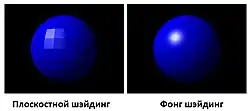 Здесь цвет рассчитывается для одной точки на каждом многоугольнике (обычно для первой вершины в многоугольнике, но иногда используется центроид для треугольных сеток) на основе нормальной поверхности многоугольника и предположения, что все многоугольники плоские. Затем в любом месте цвет интерполируется путем окрашивания всех точек на многоугольнике так же, как и точки, для которой был рассчитан цвет, что дает каждому многоугольнику однородный цвет (аналогично, интерполяции методом ближайшего соседа). Обычно эта техника используется для высокоскоростного рендеринга, где более продвинутые методы шэйдинга слишком дороги в вычислительном отношении. В результате плоскостного шэйдинга все вершины многоугольника окрашиваются в один цвет, что позволяет различать соседние многоугольники. Зеркальные блики плохо отображаются с плоскостным шэйдингом: если в репрезентативной вершине имеется большой зеркальный компонент, эта яркость равномерно рисуется по всей грани. Если зеркальная область не попадает в репрезентативную точку, оно полностью пропускается. Следовательно, компонент зеркального отражения обычно не включается в вычисление плоскостного шэйдинга.