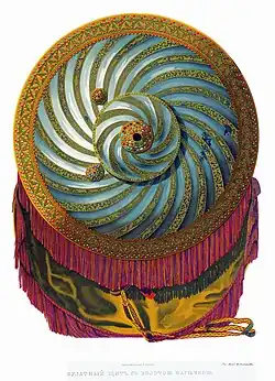 Щит выкован из цельного листа червленой булатной стали и прочеканен спиральными полосами. Пространство щита разделено на две секции — среднюю и внешнюю. В средней секции спиральные полосы идут по часовой стрелке, а внешний — наоборот. Эти полосы через одну инкрустированы резными изображениями цветов, зверей и жанровых сцен — батальных, охотничьих и других. Изображения сделаны в стиле иранских миниатюр XVI века. По центру щита расположена бляха-«плащ», украшенная драгоценными камнями. Ещё две бляхи меньшего размера расположены на внешней секции щита. Внешний край щита обильно украшен мелкими драгоценными и полудрагоценными камнями.