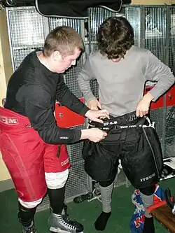 | Трусы (шорты) | Хоккейные шорты предназначены для предотвращения травмирования хоккеиста при падениях, столкновениях, попаданиях шайбы (мяча) и других случаях. Сшиты из специальной высокопрочной искусственной ткани, с жёсткими вставками на бёдрах, копчике, пояснице и позвоночнике. В шортах вратаря применяются более прочные вставки. | |