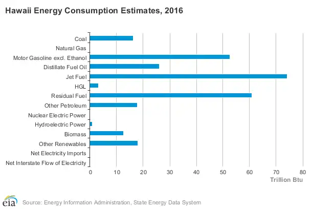 На Гавайях самая высокая доля использования нефти в Соединённых Штатах: в 2017 году около 62% электроэнергии производилось за счёт нефти.[1] По состоянию на 2016 год 26,6% электроэнергии было получено из возобновляемых источников, в том числе солнечной, ветровой, гидро- и геотермальной.[2]