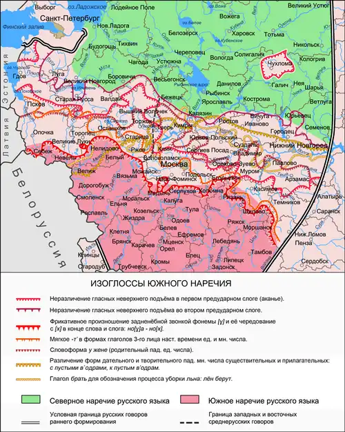 Основной изоглоссой, отделяющей южнорусский диалект от среднерусского и северорусского, является фрикативное произношение фонемы /г/, то есть [ɣ]. Однако часть изоглосс объединяет южнорусское наречие с частью среднерусских говоров (в основном южных), прежде всего: