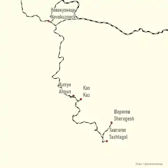 Проходит по территории Куйбышевского района Новокузнецка (до Абагуровского), городов Калтан (от Шушталепа до Малиновки) и Осинники, Сосновского от родников до Ашмарино, Куртуковского (от Малиновки до Пионерлагеря), Кузедеевской, Сосновской, Куртуковской территорий Новокузнецкого района, Мундыбашского, Темиртауского, Казского, Таштагольского городских и Каларского сельского поселения Таштагольского района.
