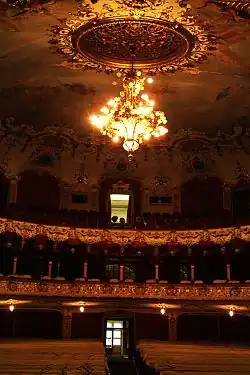 1418 электрических ламп и люстра со 109 венецианскими хрустальными лампами освещают театр с уникальной архитектурной индивидуальностью.