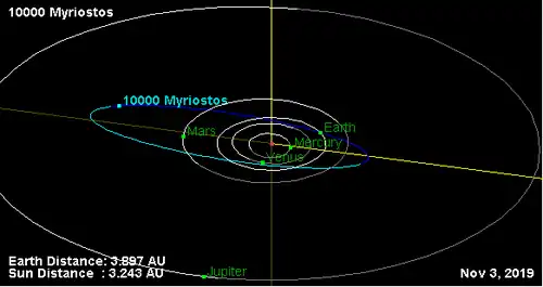 ![]() Орбита астероида (10000) Мириостос (синим), орбиты планет (красным) и Солнце в центре (чёрным). | |