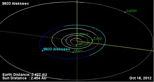 ![]() Орбита астероида (9933) Алексеев (синим), орбиты планет (красным) и Солнце в центре (чёрным). | |