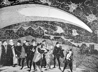 - Тихо Браге приступил к работе в Ураниборге и 20 лет проводил систематические точные наблюдения за небесными светилами[2]. В частности, из наблюдений за Большой кометой 1777 года он сделал правильный вывод, что кометы движутся за пределами земной атмосферы, по крайней мере втрое дальше, чем Луна (даже Галилей думал иначе)[3].
