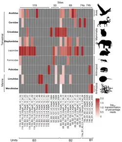 - Murchie et al. реконструировали митохондриальные геномы дикой лошади (Equus caballus), степного зубра (Bison priscus), шерстистого мамонта (Mammuthus primigenius) и белой куропатки (Lagopus lagopus), живших на территории нынешнего центрального Юкона (Канада) около 30 000 лет назад. Образцы экологической ДНК были выделены из ила, обнаруженного в многолетней мерзлоте[21].