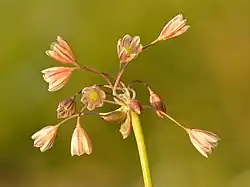 Чехол в два — три раза длиннее зонтика. Зонтик с луковичками, пучковатый или пучковато-полушаровидный, рыхлый, немногоцветковый, очень редко с одними луковичками без цветков. Цветоножки неравные, в два — четыре, до шести, раз длиннее околоцветника, обычно изогнутые; листочки узко-колокольчатого околоцветника зеленоватые или чаще розоватые, длиной 6—7 мм, равные, линейно-продолговатые, тупые, с закруглённой верхушкой, часто снабжённой очень небольшим кончиком. Нити тычинок цельные, равны листочкам околоцветника, на 1⁄5 между собой и с околоцветником сросшиеся, шиловидные; пыльники жёлтые. Столбик выдаётся из околоцветника.