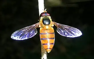 Гипоплевры с пучком умеренно длинных волосков перед нижнем краем дыхальца. R4+5 умеренно погружена в ячейку r5. Нижняя часть лица выступает за лобный бугорок[1].
