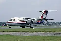 VIP или корпоративная версия. 146 стал первым реактивным самолётом который стал использоваться специальным подразделением ВВС Великобритании для перевозки VIP-персон, включая королевскую семью, и был введён в эксплуатацию в 1986 после того, как предварительно два взятых в аренду самолёта хорошо себя зарекомендовали. Самолёт в VIP-конфигурации рассчитан на 19 пассажиров и 6 членов экипажа[7]. - 146-QT (Quiet Trader)