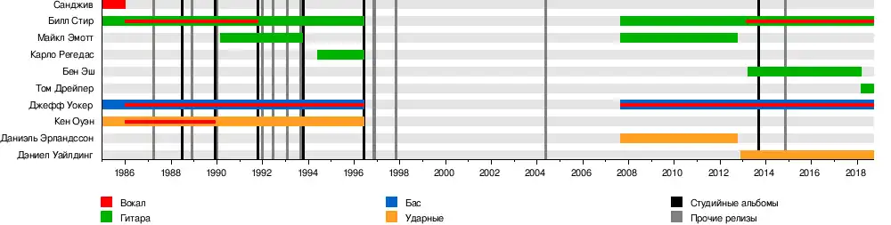- Билл Стир — гитара (1985—1996; 2007 — настоящее время), вокал (1987—1992, 2013 — настоящее время)