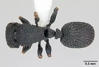 Мелкие муравьи чёрного цвета. Длина тела рабочих 3,6—3,7 мм. Длина головы равна 0,90—0,94 мм (ширина головы — 0,86—0,88 мм). Проподеум угловатый с 2 длинными заострёнными шипиками. Нижнечелюстные и нижнегубные щупики состоят из 5 и 3 члеников соответственно. Скапус короткий, длина его у рабочих равна 0,48 мм. Глаза крупные, расположены в заднебоковой части головы. Усики рабочих состоят из 11 члеников и имеют булаву из трёх вершинных сегментов. Голова и грудь с многочисленными морщинками. Первый тергит брюшка сильно увеличенный. Стебелёк между грудкой и брюшком состоит из двух члеников: петиолюса и постпетиолюса (последний четко отделен от брюшка), жало развито, куколки голые (без кокона)[1][2].