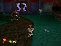 Джим стреляет во врага из бластера. В отличие от предыдущих игр серии, в Earthworm Jim 3D необходимо собирать шарики мрамора и золотые вымя для прохождения
