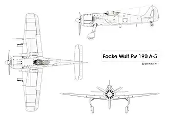 Серия А-5 истребитель-штурмовик. Для защиты лётчика при атаках наземных целей помимо переднего бронестекла толщиной 50 мм, бронеспинки толщиной 8 мм и сдвижного бронезаголовника 13,5 мм, была установлена броня по внешним обводам фюзеляжа: снизу, под мотором — 6 мм, под фюзеляжем до заднего обреза кабины — 5 мм, имелась бортовая броня кабины пилота. Все 18 плит крепились непосредственно на фюзеляж, составляя его обтекаемую поверхность. Общая масса брони составляла 310 кг или 7,6 процентов от нормальной взлётной массы самолёта. В 1942 г. в результате испытаний FW-190A-3 выяснилось, что установка дополнительного оборудования может заметно сместить центр тяжести самолёта. Чтобы компенсировать смещение, было решено удлинить мотораму, в результате чего общая длина самолёта увеличилась до 9100 мм. Первые машины, получившие обозначение FW-190A-5, вступили в строй в ноябре 1942 года. Предназначались для оказания непосредственной поддержки на поле боя.