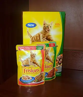 Под торговой маркой Friskies выпускаются разнообразные виды сухого и желеобразного видов кормов для кошек[2] с различным вкусом и добавками.