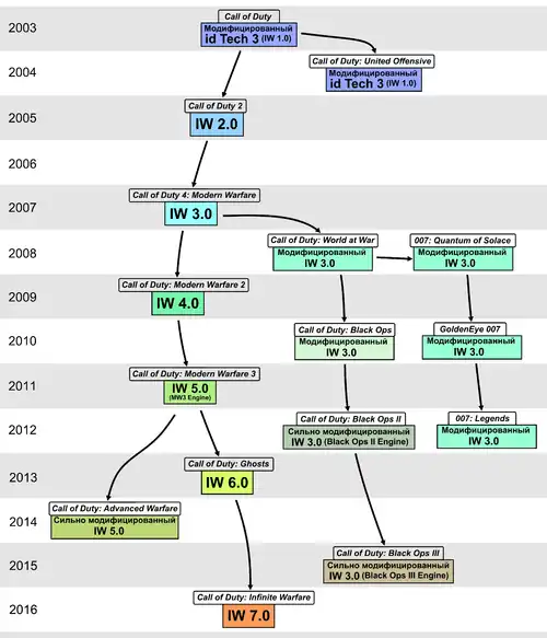 За Modern Warfare последовала Call of Duty: World at War 2008 года. На сей раз разработкой игры занималась студия Treyarch, а в основу движка был положен IW 3.0, при этом он был доработан силами сотрудников Treyarch. Все последующие игры серии, разработанные Treyarch, уже базировались на этой модификации третьей версии движка: с каждой новой частью компания улучшала движок, основанный на IW 3.0, тогда как Infinity Ward продолжала развитие ветви (новые цифровые индексы в названии, например, 4.0, 5.0 и пр.) добавлялись именно к ветви Infinity Ward).