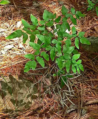 Конечные доли вегетативных вай простые, овально-яйцевидные, цельнокрайние, до 20 мм шириной и 50 мм длиной, на черешках 2—6 мм длиной, изредка сидячие. Верхние конечные дольки вегетативных вай иногда слегка зубчатые у вершины. Верхняя поверхность конечной доли вегетативной вайи зелёная (в гербарии грязно-зеленая) и светло жёлтая (до сизой) с нижней стороны. Жилки конечной доли вегетативной вайи четко выражены, особенно срединная, слегка расширены в апикальной части.