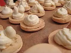 Макаро́н (фр. macaron, /makaʁɔ̃/) — французское кондитерское изделие из яичных белков, сахара и молотого миндаля[1]. Обычно делается в форме печенья; между двумя слоями кладут крем или варенье. Итальянское название maccarone/maccherone происходит от слова ammaccare — «разбить, раздавить», и является отсылкой к способу изготовления основного ингредиента, миндальной муки[2]. Готовое изделие мягкое, с гладкой поверхностью, тает во рту. Разнообразно по вкусу.