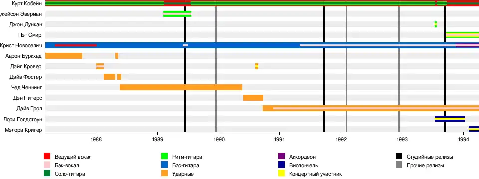 - 1 2 3 4 5 6 7 8 9 10 11 Nirvana Timeline (англ.). Дата обращения: 28 апреля 2011. Архивировано из оригинала 21 мая 2012 года.