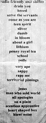 Менее чем через две недели Nirvana выступила на MTV Video Music Awards[37]. Руководство MTV хотело, чтобы группа сыграла «Smells Like Teen Spirit», но музыканты пожелали исполнить новую песню, которая называлась «Rape Me» (рус. Изнасилуй меня). Руководители MTV были недовольны песней, так как, по словам продюсера шоу Эми Финнерти, они решили, что в тексте речь идёт о них. Они настояли на том, что Nirvana не будет играть «Rape Me», пригрозив, что не дадут группе выступить на шоу и перестанут показывать их клипы по MTV. После напряжённых споров MTV и Nirvana договорились, что группа сыграет песню «Lithium» с последнего на тот момент сингла[38]. Когда Nirvana начала выступление, Курт неожиданно сыграл и спел начало из «Rape Me», после чего заиграла «Lithium». Ближе к концу песни Новоселич, недовольный тем, что его усилитель перестал работать, подкинул бас-гитару в воздух для драматического эффекта, но не смог её поймать, и она ударила его по голове. Крист упал со сцены, чуть не потеряв сознание, потом поднялся и выбежал из студии[39]. В это время Кобейн разбивал аппаратуру, а Грол схватил микрофон и начал кричать: «Эй, Эксл!» (англ. Hi, Axl!), имея в виду вокалиста группы Guns N' Roses Эксла Роуза, с которым у Nirvana вышла небольшая размолвка перед выступлением[40].