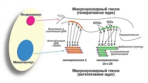 После конъюгации геном макронуклеуса строится на основе генома микронуклеуса, подвергаясь при этом значительным перестройкам: 95—96 % генома микронуклеуса при образовании генома макронуклеуса удаляется, а оставшиеся «чистые» гены (MDS англ. macronuclear destined sequences), лишённые различных некодирующих элементов, собираются из перемешанного состояния в правильном порядке. Интроны при такой перестройке не удаляются, а входят в состав сохраняемых фрагментов[5][6].