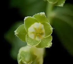 Цветоножки выходят из пазух листьев, с 3—5 цветками, голые. Околоцветник суженный над зевом, кверху немного расширенный, с шестью зеленоватыми зубцами, которые наверху с внутренней стороны коротко опушённые. Тычиночные нити волосистые. Цветёт в мае — июне.
