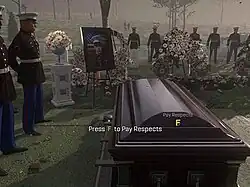 «Press F to pay respects» (с англ. — «Нажмите F, чтобы почтить память») — интернет-мем, возникший в игре Call of Duty: Advanced Warfare, шутере от первого лица 2014 года из франшизы Call of Duty компании Activision. После выхода игры в ноябре 2014 года многие критики и игроки видеоигры высмеяли внутриигровое событие в режиме реального времени за его принудительный элемент интерактивности, который казался неуместным на моменте с похоронной службой. С тех пор он используется интернет-комментаторами для выражения сочувствия или признания в связи с печальными событиями.