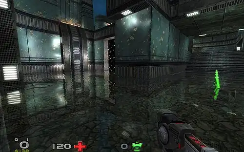 Шейдерная вода, которая реалистично отражает окружающий мир в игре Nexuiz.