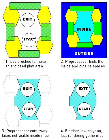 Кисти размещаются и поворачиваются так, чтобы создать закрытые, пустые, объёмные пространства. Когда дизайн карты закончен, эта карта пропускается через препроцессор рендеринга. Этот препроцессор используется для определения местонахождения двух типов пустого пространства на карте: пустого пространства, созданного кистями, в котором будет находиться игрок во время игры; и другого пустого пространства, которое находится снаружи кистей и которое игрок никогда не увидит. Потом препроцессор убирает невидимые поверхности с отдельных кистей, которые находятся вне игрового пространства, и оставляет только те полигоны, которые определяют лишь внешний периметр внутреннего игрового пространства — таким образом достигается значительная оптимизация движка, и как следствие, ускоряется его работа.