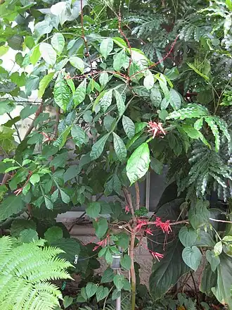 Дерево или высокий кустарник, высотой 3-8 м, с непарноперистыми листьями длиной 15-25 см, имеющими 3-5 листочков. Они тёмно-зелёные с ярко-красной главной жилкой и общим черешком. Цветки крупные до 4 см длиной, ярко-красные снаружи и белые изнутри, собраны в густые боковые и верхушечные кисти 15-25 см длиной. Плод — мелкая чёрная костянка, 1-1,5 см диаметром.