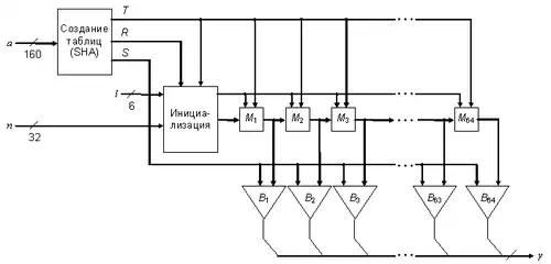 - использование большой (примерно 2 Kбайта) таблицы T, получаемой из большого 160-битного ключа;