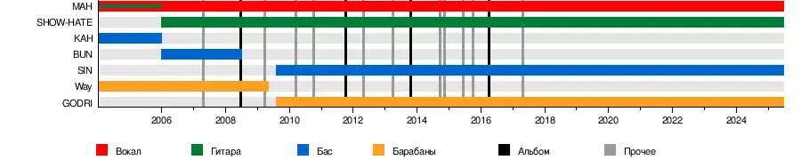 - MAH (Манабу Танигути) — вокал (2004 — н.в.), гитара (2004—2006)