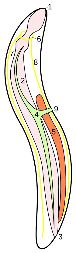 1 — передний конец тела, несущий рот; 2 — кишечник; 3 — клоака; 4 — выделительная система; 5 — семенник; 6 — нервное кольцо; 7 — дорзальный нерв; 8 — вентральный нервный ствол; 9 — выделительное отверстие.